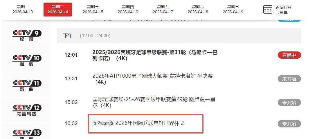 2026-04-16雨燕直播,NBA直播,世界杯直播,足球直播,台球直播,体育直播,世界杯,欧洲杯,苏超直播,村BA直播,苏超联赛,村超,村超直播根据央视体育的官方节目表,4月14日当天,与乒乓球相关的转播并不止CCTV5这一场。 在下午16点32分,CCTV5+频道也会播出“实况录像-2026年国际乒联单打世界杯 2”。 到了4月16日,CCTV5在晚上20点30分还会安排一场男单比赛的实况录像。 这些安排显示,在4月28日伦敦世乒赛团体赛开打之前,电视转播将以回顾近期经典赛事为主,为大赛预热。