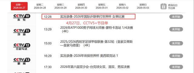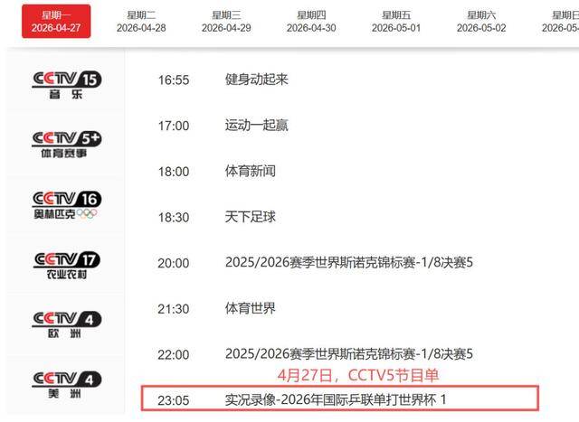 4月27日,央视平台乒乓最新官方转播时间表出炉,主频道CCTV5,今晚23点05分将准时播出2026年国际乒联单打世界杯精彩实况录像。